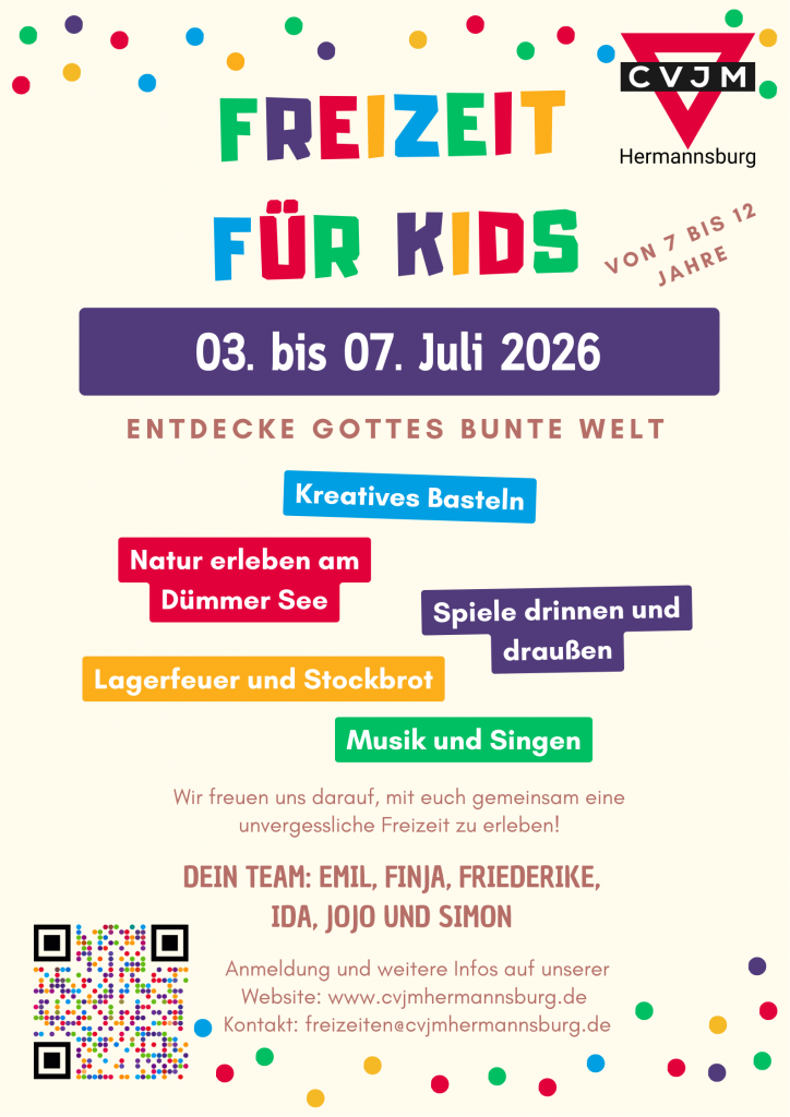 Vom 3. bis 7. Juli 2026 fahren wir gemeinsam in das CVJM-Freizeitheim in Burlage am Dümmer See. Mitfahren können alle Kinder von 7 bis 12 Jahren. Passend zu unserem Motto „Gottes bunte Welt entdecken“ erwarten dich ein vielfältiges Programm: